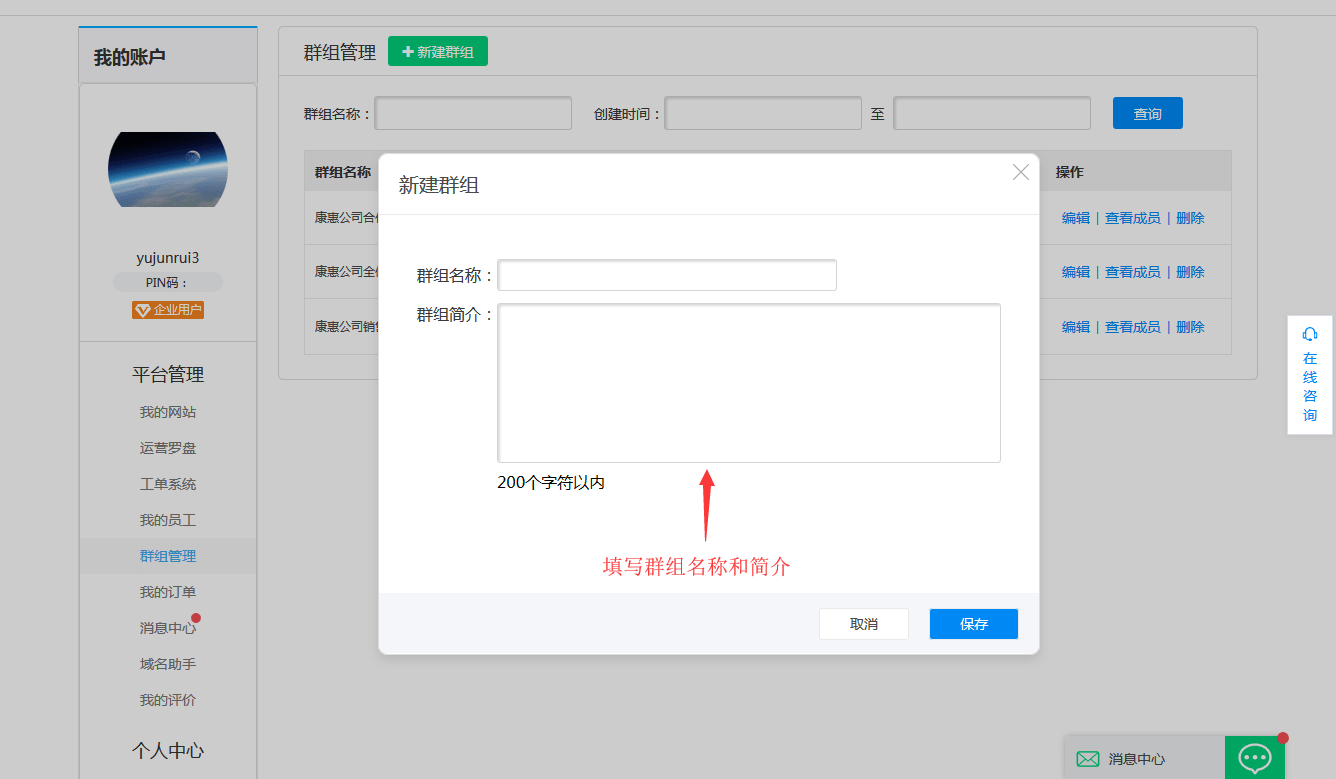 【操作方式】登录进入维看云中台-》群组管理-》新建群组-》填写群组名称以及简介。